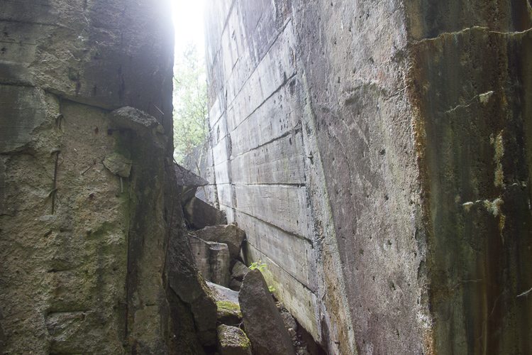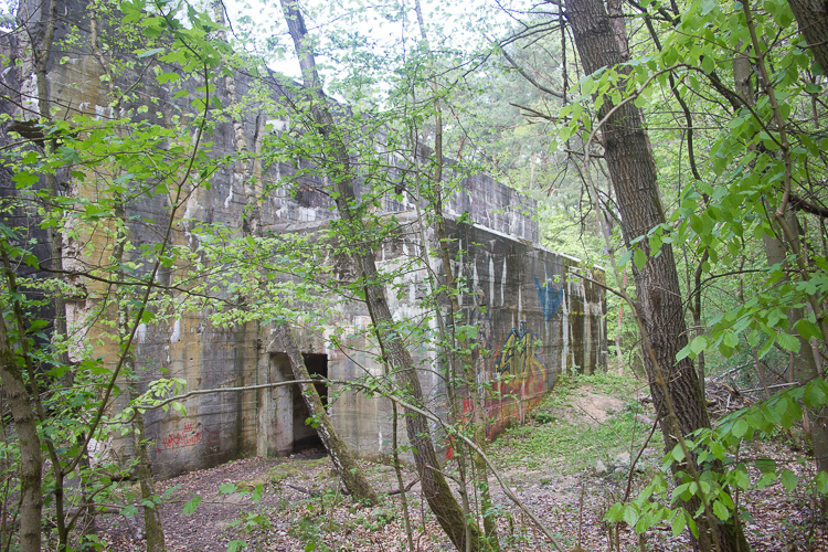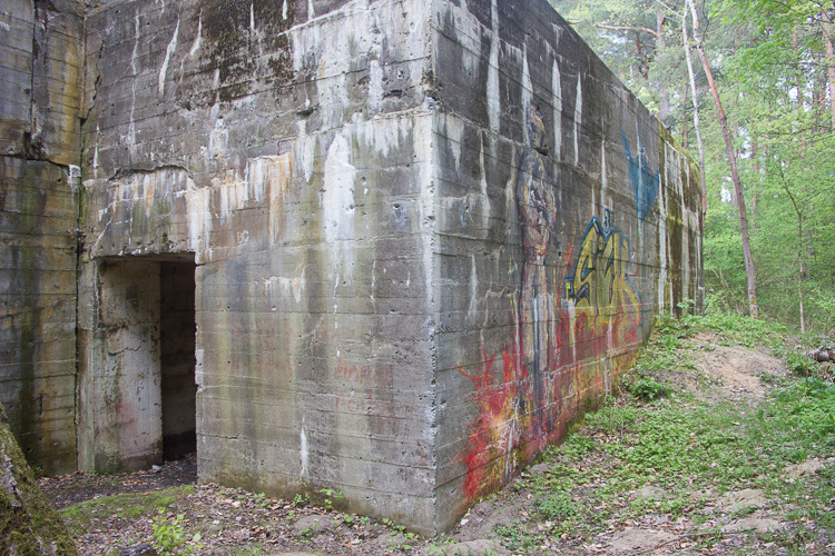 Westlich des Nachrichtenbunkers finden wir heute die stattliche Ruine des sogenannten Hochbunkers. Er wurde 1944 mittels modernster Baumethoden errichtet. In ihm befand sich der Fernschreibdienst des OKM . Außerdem sollte er im Falle eines Luftangriffes 750 Personen Schutz bieten können. Entgegen den Angaben von Dr. Pfeiffer betrug die Deckenstärke 3,00 Meter und die Wandstärke 2,50 Meter, in beiden Eingangsbereichen 80 cm. Die obere Deckenstärke wurde nachträglich erhöht. Die an den Stirnseiten gelegenen Eingangsbereiche waren als Schleusenbereiche ausgebildet. Die Deckenhöhe in den 3 Geschossen lag bei 2,20 Meter. Hartnäckig hält sich auch das Gerücht von mindestens einer unterirdischen Etage, die jedoch nicht nachgewiesen werden konnte. Einige ehemalige Schüler aus Lanke behaupten jedoch, in den 80- er Jahren unter dem Hochbunker gewesen zu sein. Dafür sprechen plötzlich aufgetauchte Marinemäntel im westlichen Teil des Bunkers und Aktivitäten des Staatssicherheitsdienstes an den betreffenden Schulen. Die Unterlagen sind jedoch bislang “verschwunden”. In der Untergrabung des Bunkers konnten unter der Bodenplatte keine weiteren Hinweise auf irgendwelche unterirdischen Anbindungen gefunden werden. Der Bunker ist ein modifizierter Marine-Regelbau des Typs T750. Das waren reine Luftschutzbunker für 750 Personen, die vorzugsweise im Küstenbereich errichtet worden sind. Der in Koralle ist der am weitesten südlich stehende dieser Serie. Die Sprengung erfolgte durch die russische Besatzungsmacht in den Jahren 1946/47 als Munitionssprengung.